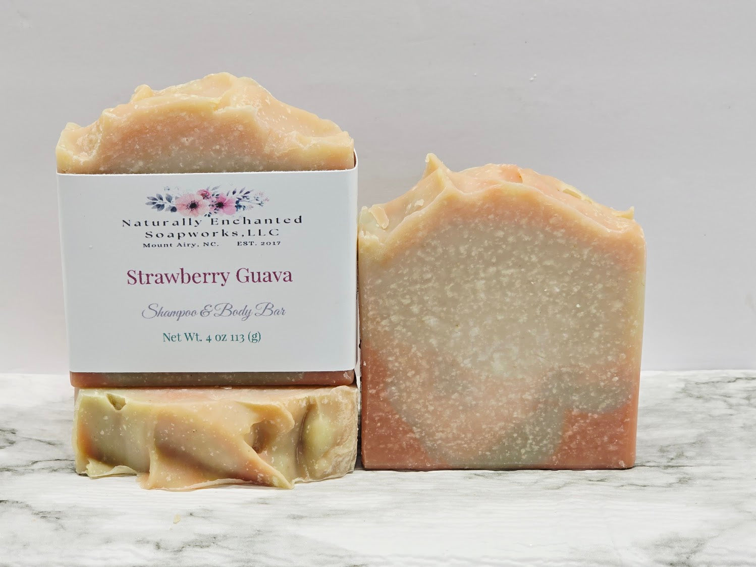 Strawberry & Guava- (Perfect for most hair types.) Apple Cider Vinegar, coconut oil, Sustainable Palm oil, Sunflower oil, Olive oil, Avocado oil, Sodium Hydroxide, Castor oil, Shea Butter, Cocoa Butter, Fragrance, French Green Clay, Rose Clay, Marshmallow Root, Coconut Milk